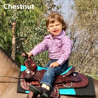 This sharp-looking saddle isn’t just mini-sized—it’s specially designed to be small enough for minis and ponies, but large enough for the cuties riding them. And it’s a joy to ride! Fully tooled with decorative conchos, with double square skirts, full floral tooling, and a quilted seat in Ostrich print cowhide, it’s perfect for the showring. The rider will get many years of use from the adjustable stirrups, and the leather is crafted to last a lifetime as well. Choose chestnut or black for the trunk color, and contrast the look with your choice of colorful seats.